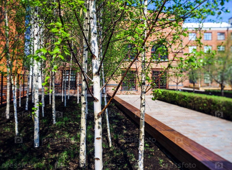 Небольшие молодые березы в городском парке весной
