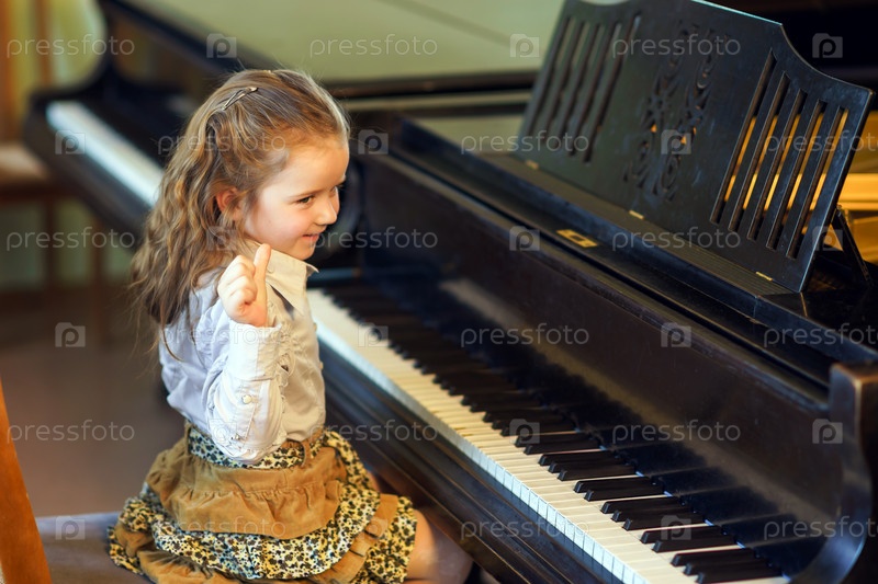 Милая маленькая девочка, играя на фортепиано в музыкальной школе
