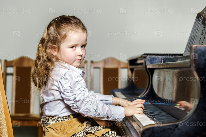 Милая маленькая девочка, играя на фортепиано в музыкальной школе