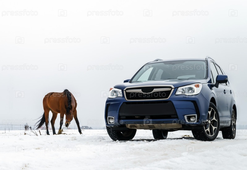 Мощный автомобиль внедорожник 4х4 и лошадь
