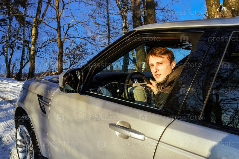 Портрет молодого взрослого водителя 4х4 внедорожника