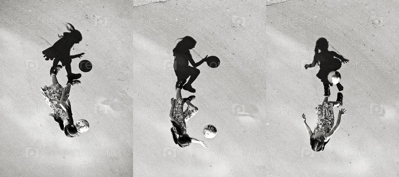 Маленькая девочка, играя тень мяча, набор фотографий