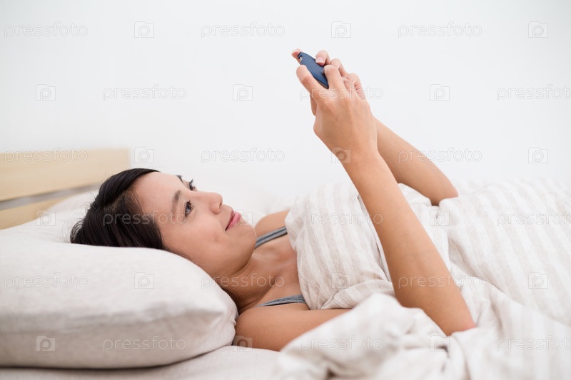 Женщина, лежа вниз в постели и читать на сотовый телефон