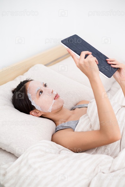 Женщина с помощью планшетного ПК и маски