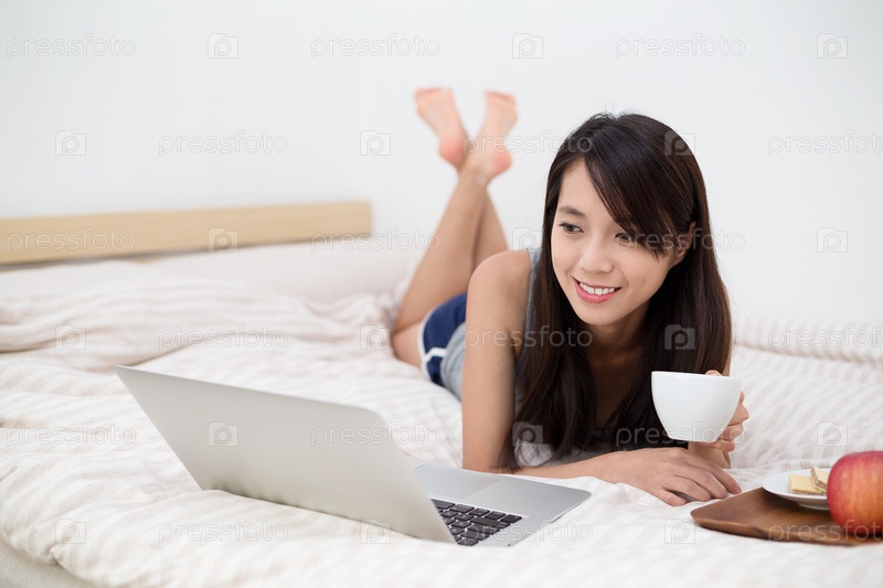 Женщина, лежа с портативного компьютера и ее завтрак