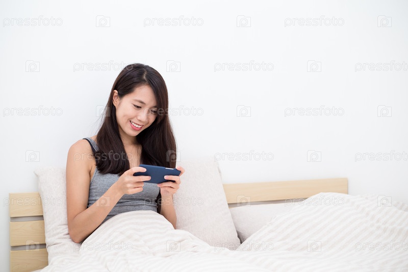 Женщина использование мобильных телефонов лежа на кровати