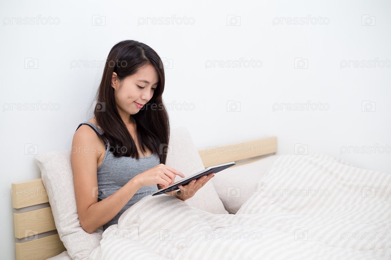 Женщина с помощью планшетных ПК в постели