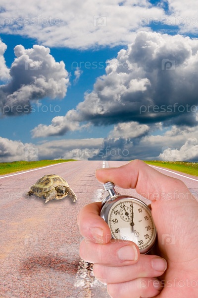 Ползущая черепах на асфальтированной дороге и рука с остановленным секундомером