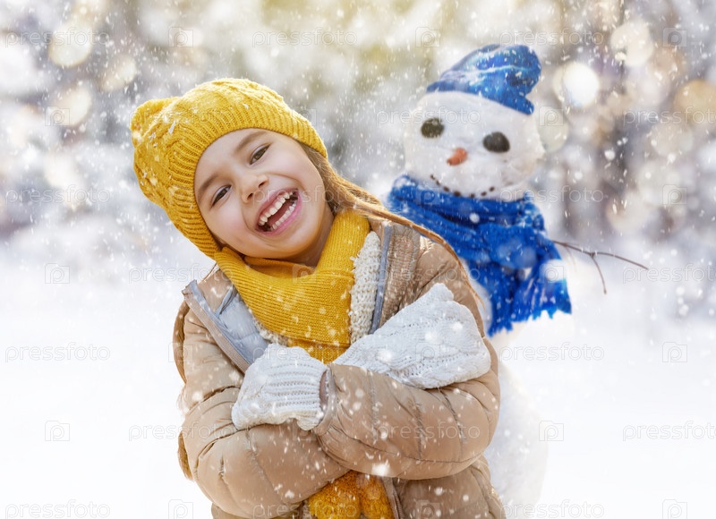Девочка играет с снеговика