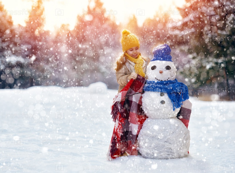 Девочка играет с снеговика