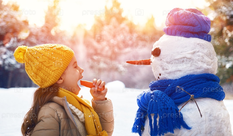 Девочка играет с снеговика