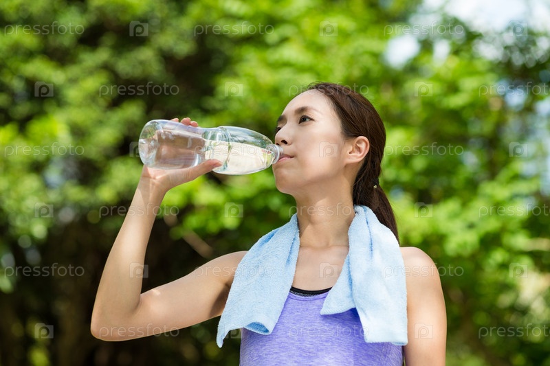 Девушка пьет воду после пробежки
