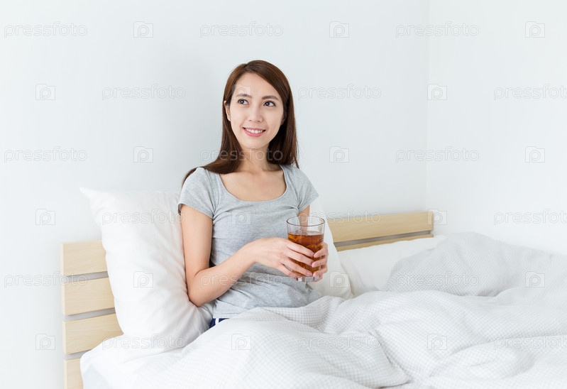 Девушка позирует со стаканом чая, сидя в постели