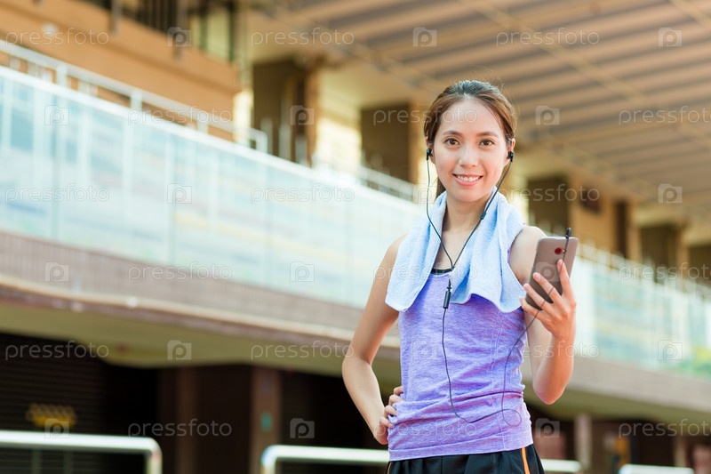 Девушка слушает музыку после пробежки