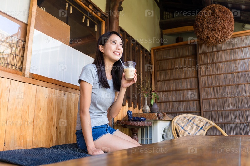 Девушка пьет кофе, сидя в кафе