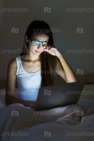 Девушка работает за ноутбуком, сидя в постели