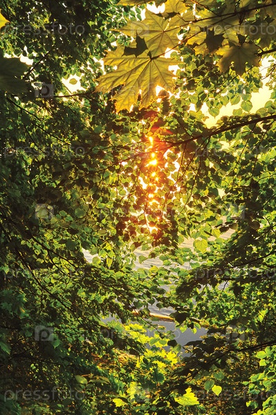 Солнечные лучи, пробивающиеся сквозь листья деревьев