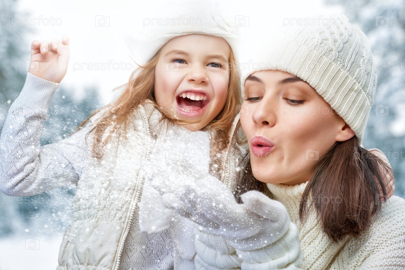 Мать и дочь радуются снегу