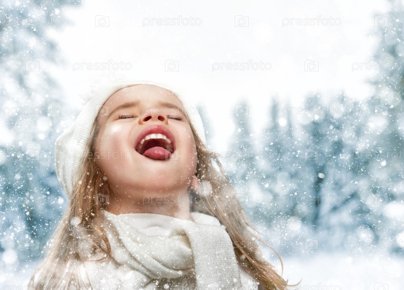Девочка ловит снежинки языком