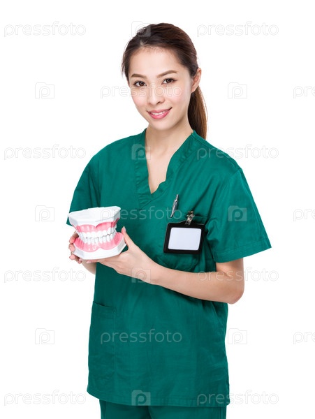 Стоматолог с пластмассовым протезом челюсти