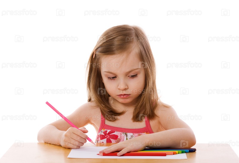 Маленькая девочка рисует за столом на белом фоне