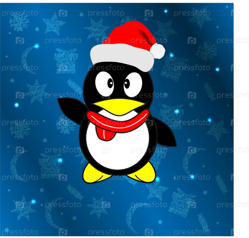 Пингвин в шапке Санта Клауса, на новогоднем фоне