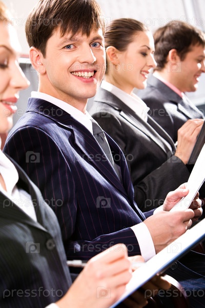 Портрет улыбающегося мужчины, сидящего между своими коллегами на бизнес-семинаре