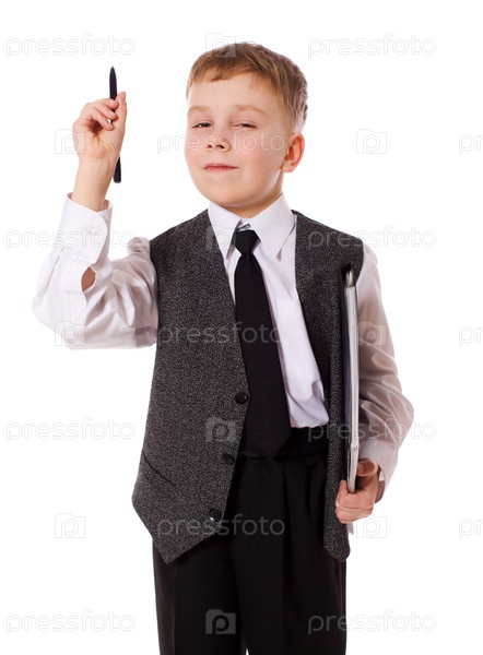 Серьезный мальчик-бизнесмен на белом фоне