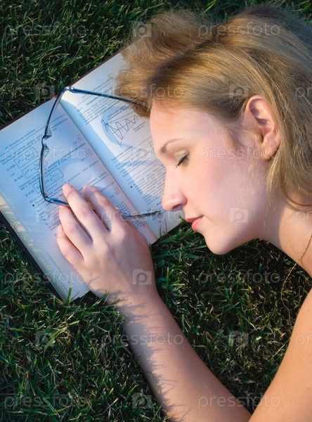 Молодая женщина спит на книге на открытом воздухе