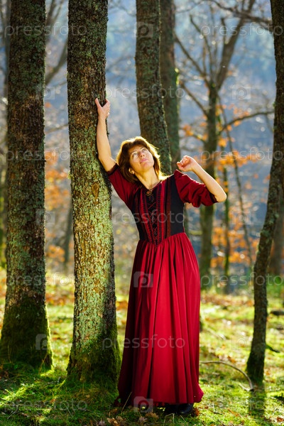 Женщина в красном платье в лесу