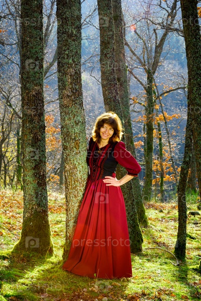 Женщина в красном платье в лесу