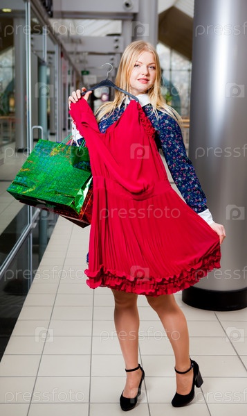 Женщина примеряет красное платье
