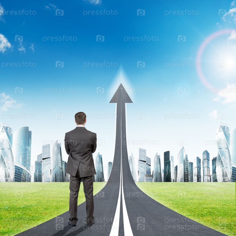 Бизнесмен, стоя на шоссе дороге, идущей как стрелка в небе