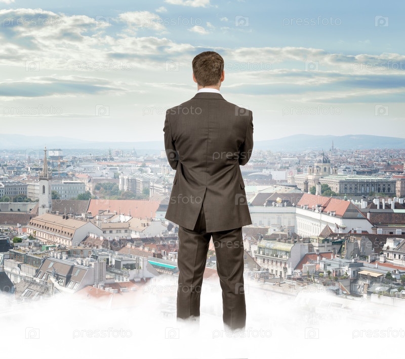Бизнесмен, стоя на облака, глядя на город, вид сзади