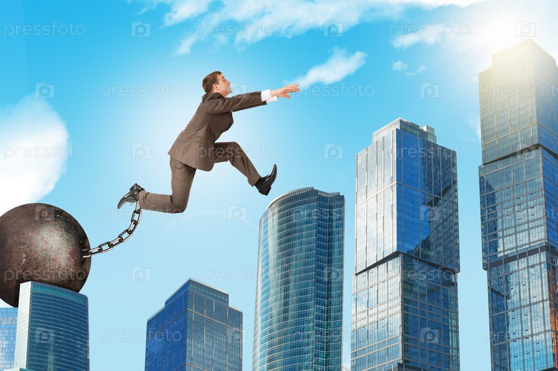 Изображение молодого бизнесмена с балластом железа, перепрыгивая через пробел на фоне города