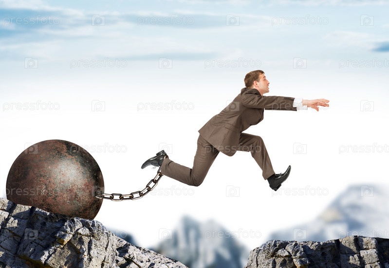 Изображение молодого бизнесмена с балластом железа, перепрыгивая через пропасть