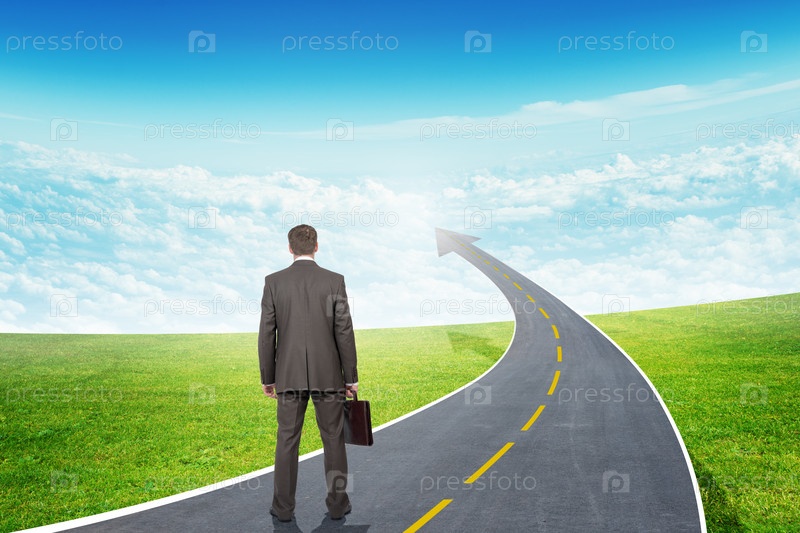 Бизнесмен, стоя на шоссе дороге, идущей как стрелка в небе