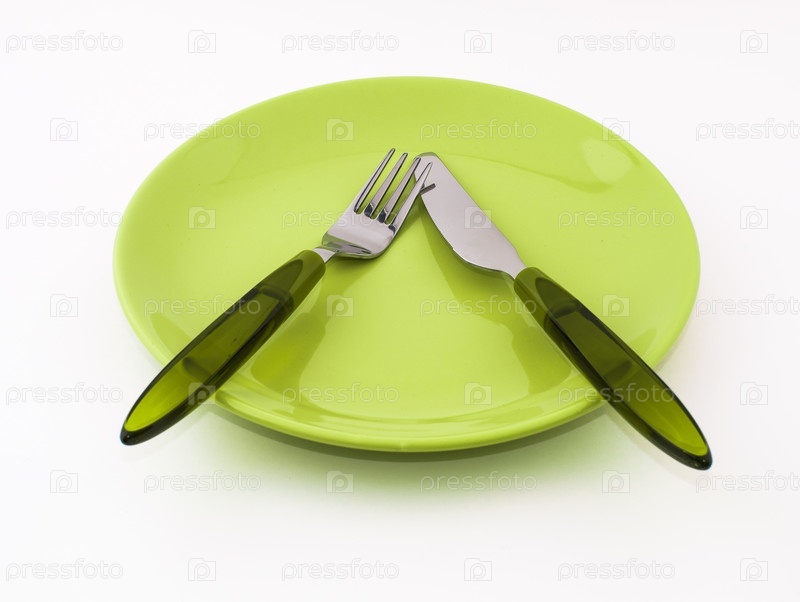 Тарелка, нож и вилка на белом фоне
