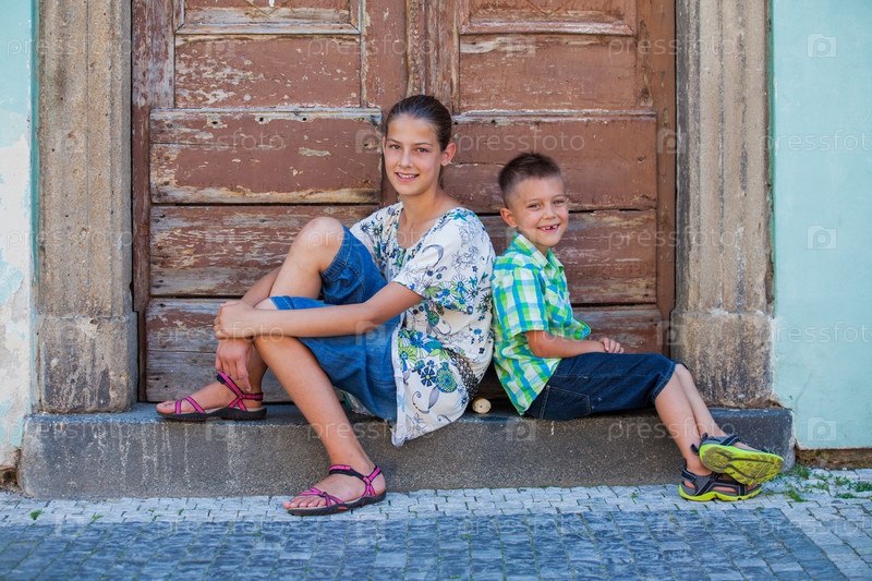 Дети сидят на бордюре