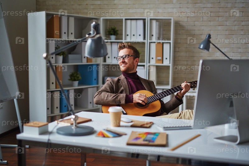 Мужчина играет на гитаре на рабочем месте