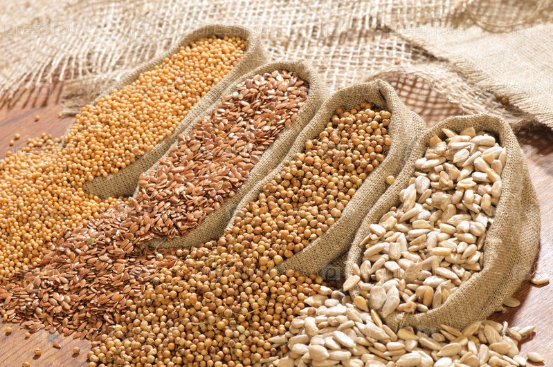 Семена горчицы, льна, кориандра и подсолнечника просыпались из льняных мешочков
