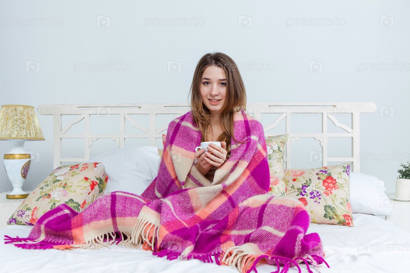 Больную женщину, покрытая одеяло, держа чашку чая