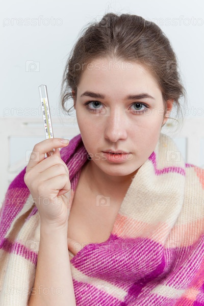 Молодая женщина больных в одеяло с термометром