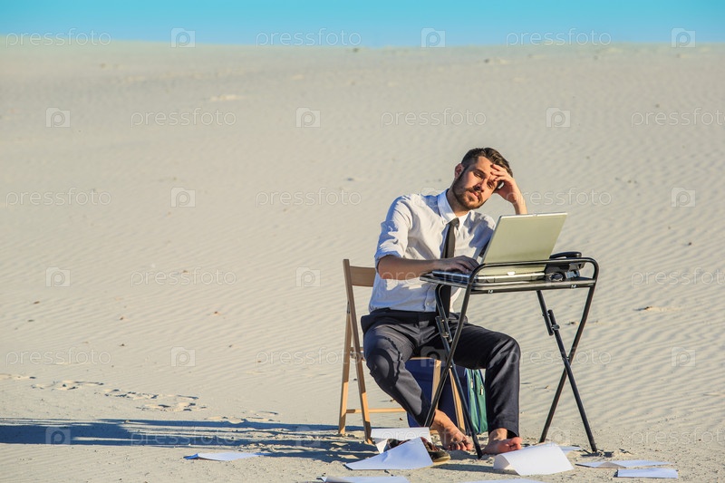 Бизнесмен, используя ноутбук в пустыне