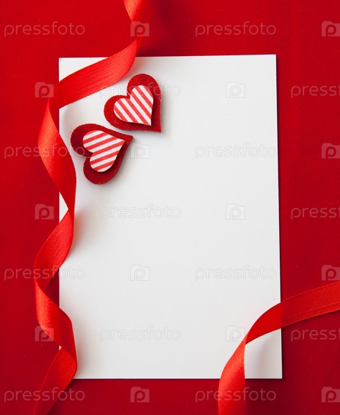 Два сердечка и белый лист бумаги на красном фоне