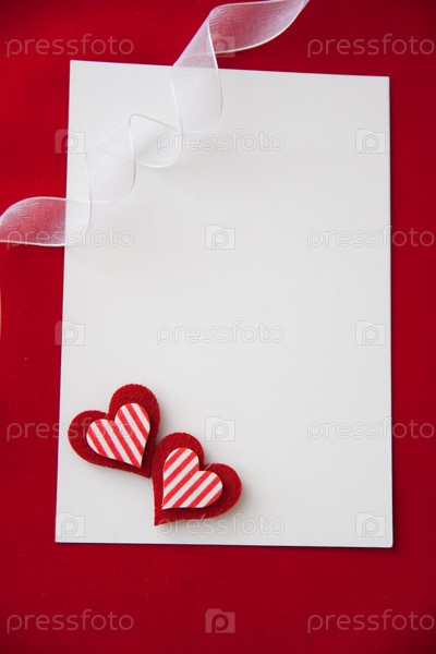 Два сердечка и белый лист бумаги на красном фоне
