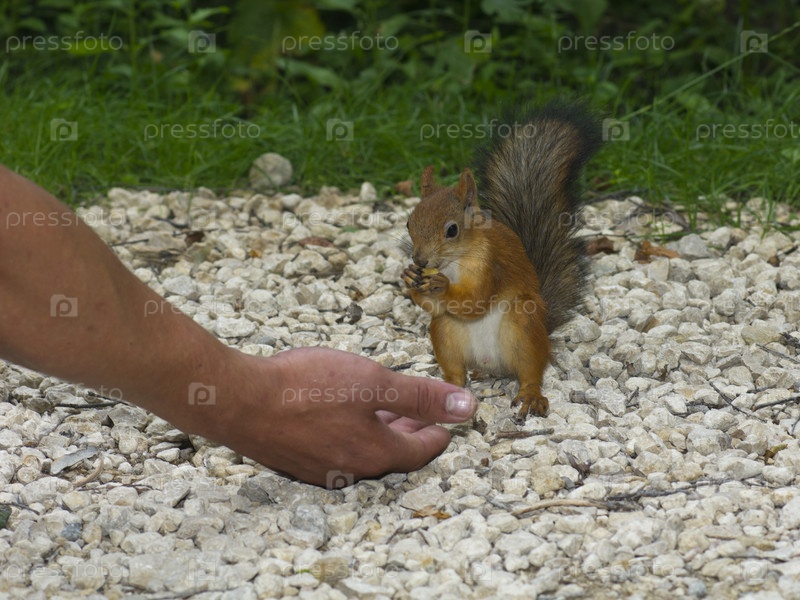Белка на камнях ест орех