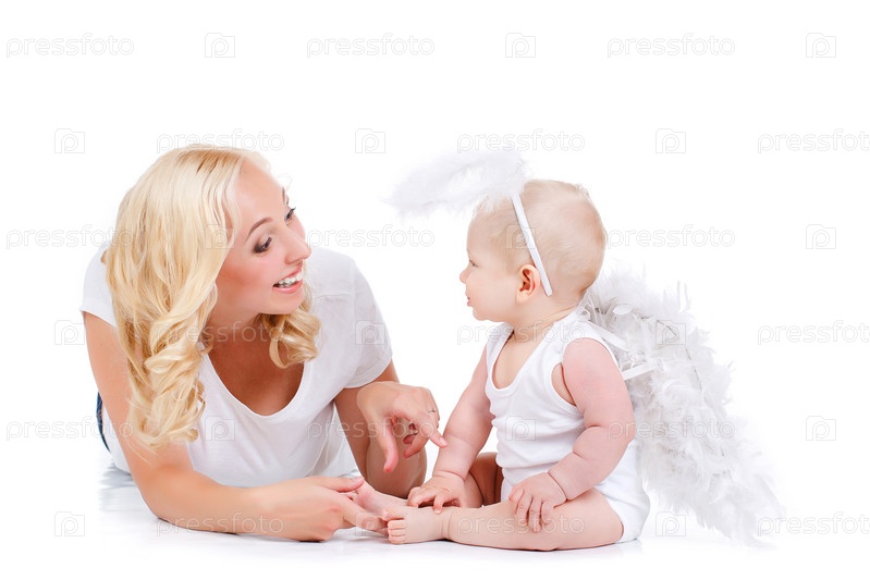 Счастливая мать и ребенок в костюме ангелка
