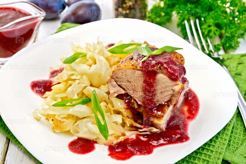 Утиная грудка с сливовым соусом и капустой