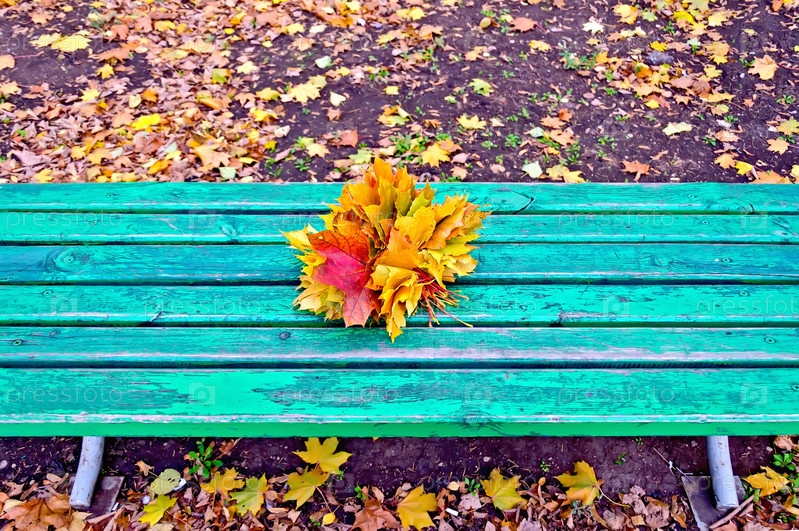 Кленовые листья на зеленой скамейке